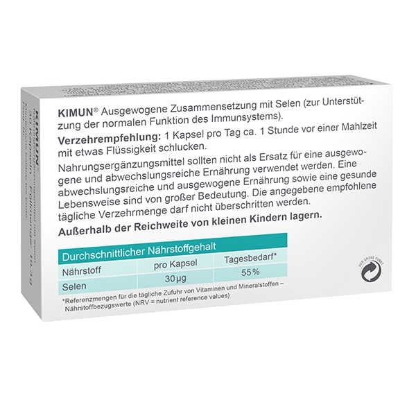 KIMUN ist ein Nahrungsergänzungsmittel mit dem Spurenelement Selen. So trägt es mit Selen zu einer normalen Funktion des Immunsystems bei und kann die natürlichen Abwehrkräfte des Körpers unterstützen. Die regelmäßige tägliche Einnahme von KIMUN ist daher besonders in Belastungssituationen als unterstützende Ernährungsmaßnahme zu empfehlen.Verzehrempfehlung
