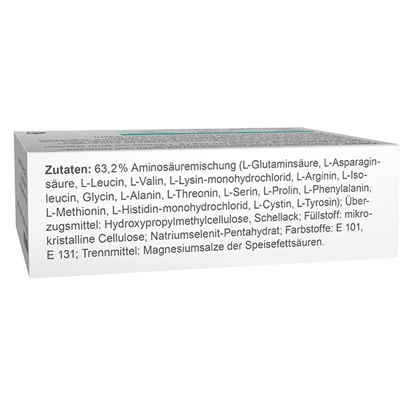 63,2 % Aminosäuremischung (L-Glutamin¬säure, L-Asparaginsäure, L-Leucin, L-Valin, L-Lysin-monohydrochlorid, L-Arginin, L-Isoleu¬cin, Glycin, L-Alanin, L-Threonin, L-Serin, L-Prolin, L-Phenylalanin, L-Methionin, L-His¬tidin-monohydrochlorid, L-Cystin, L-Tyrosin); Überzugsmittel: Hydroxypropylmethylcellu-lose, Schellack; Füllstoff: mikrokristalline Cel¬lulose; Natriumselenit-Pentahydrat; Farbstoffe: E 101, E 131; Trennmittel: Magnesiumsalze der Speisefettsäuren.Packungen